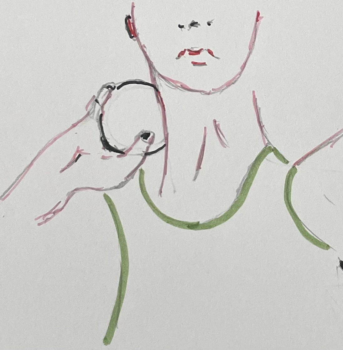Her neck covered with white chalk - the steel ball in hand -  nestled under her chin.